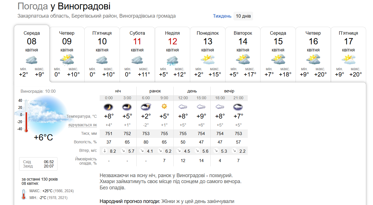 Жителі Виноградівської громади вже встигли відчути прохолодне дихання весни: вранці стовпчики термометрів опустилися до позначки +2°C, а північно-західний вітер зі швидкістю 8.2 м/с додавав відчуття сирості. Проте метеорологічні спостереження за останні 130 років заспокоюють — температурні рекорди цього дня коливалися від лютих -2°C у 1978 році до неймовірних +25°C у 1986 та 2024 роках.