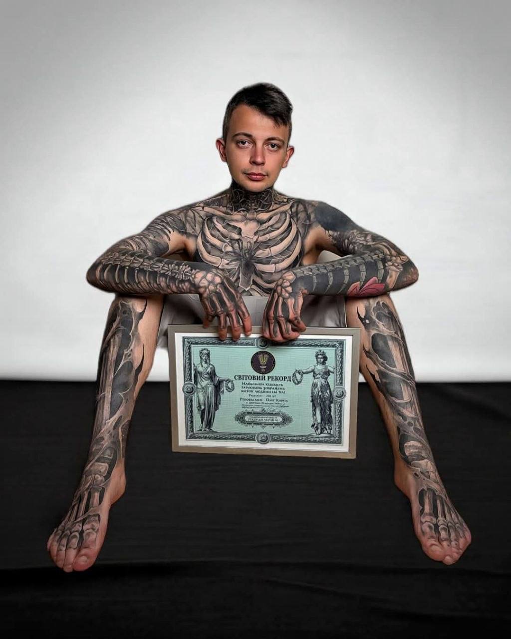 Загалом на тілі чоловіка зафіксували 230 татуювань кісток. Щоб усвідомити масштаб цієї цифри, варто згадати Ріка Дженеста, відомого як Zombie Boy. Канадська модель, яка тривалий час вважалася еталоном у цьому жанрі, мала на своєму рахунку 139 кісткових елементів. Українець не просто побив цей рекорд, він підняв планку на майже сотню пунктів.