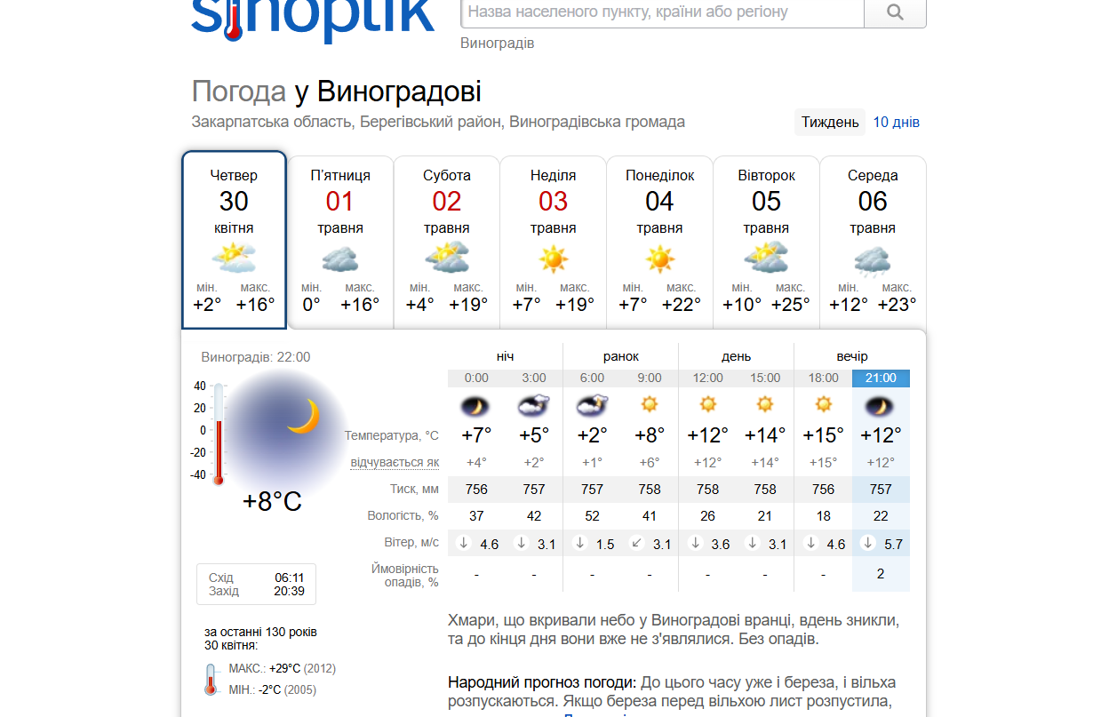 Детальний прогноз погоди у Виноградові на початок травня