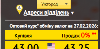 Курс валют в Ужгороді 27 лютого 2026 року: долар по 43,...