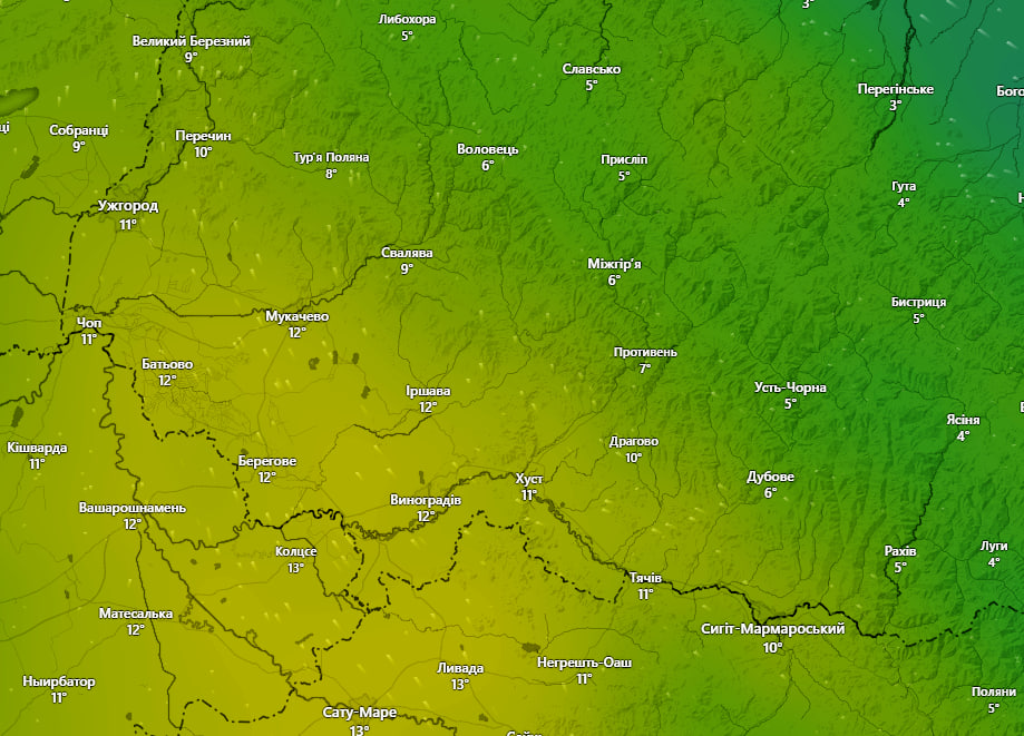 За даними Sinoptik та локальних метеорологічних моделей, температура значно різниться залежно від рельєфу. У гірських районах (Рахів, Свалява) буде прохолодніше — близько +3…+8°C. Натомість південні низовини прогріються сильніше завдяки теплому повітрю з півдня.