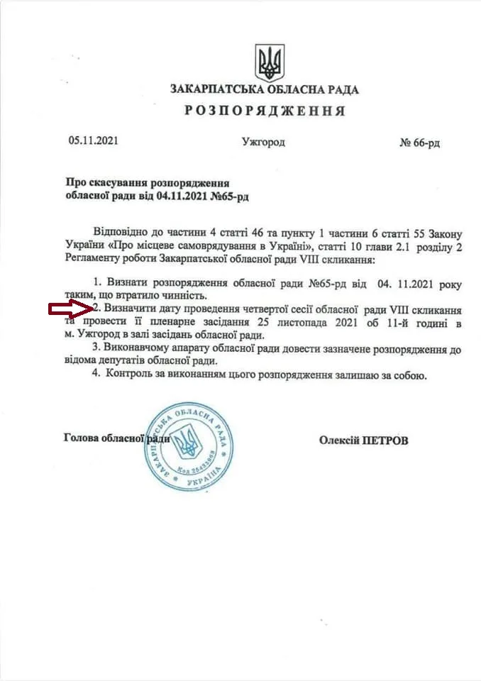 Вчора, пізно ввечері вже екс-голова Закарпатської обласної ради Олексій Петров, переклав своїм розпорядженням проведення четвертої сесії обласної ради, яке має відбутися сьогодні тим самим скасовув попереднє розпорядження в.о. голови Василя Іванчо.