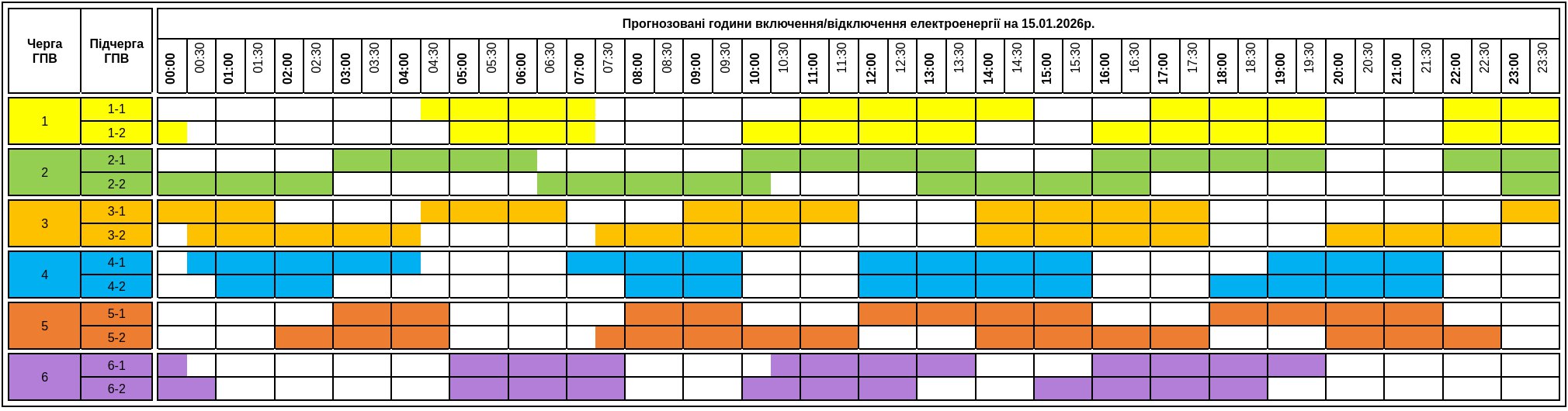 - 6 черга: вимкнення заплановані на 00:00–01:30, 05:30–09:30, 10:30–14:30 та 16:30–20:30.
