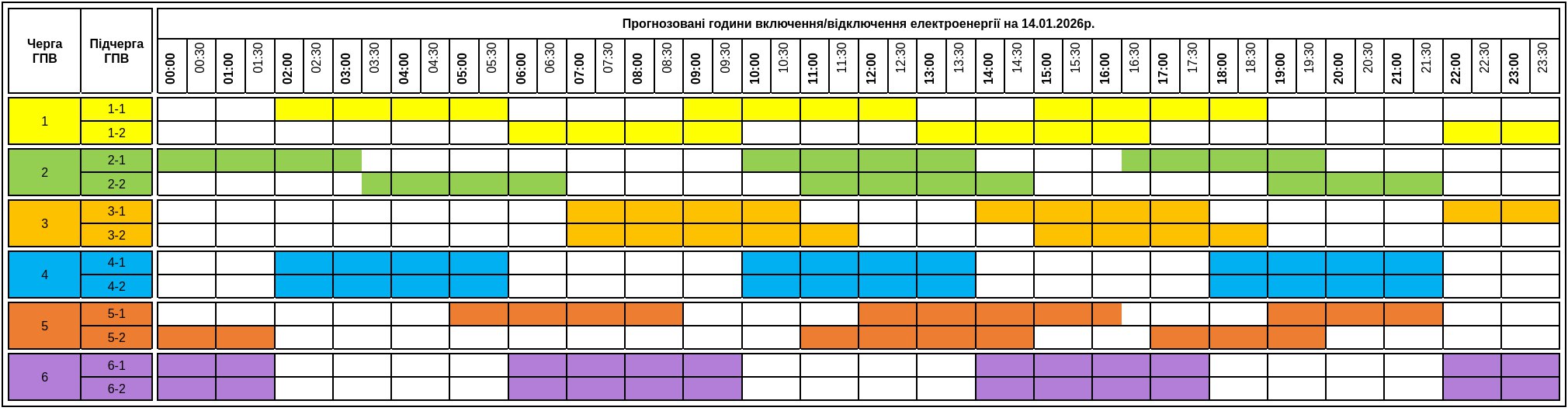 Сьогодні, 14 січня 2026 року, у Закарпатській області діють оновлені графіки погодинних відключень (ГПВ). ПрАТ «Закарпаттяобленерго» оприлюднило актуальну схему обмежень для всіх шести черг споживачів.