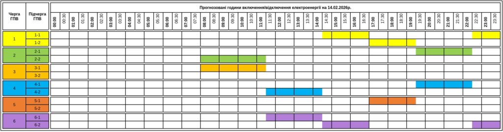 - Черга 6 (фіолетова): Підчерга 6-1 – 09:00-12:00 та 20:00-23:00; Підчерга 6-2 – 09:30-11:30 та 20:30-22:30.