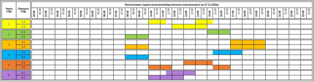 Закарпатська область, 26 листопада 2025 року – Завтра, 27 листопада, в області діятимуть розширені графіки погодинних відключень електроенергії.