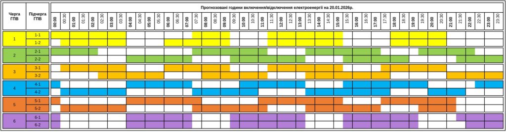 • 6 черга (6-1, 6-2): Світло вимикатимуть з 00:00 до 05:30, з 08:30 до 11:30, з 14:30 до 19:30 та з 21:30 до 23:30.