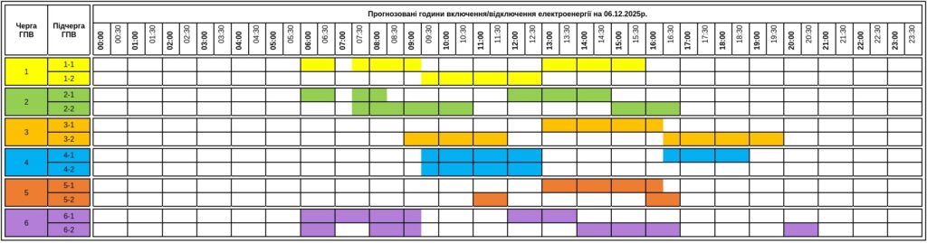 - 6-та черга (фіолетовий): Ця черга має декілька коротших періодів відсутності електроенергії, зокрема, з 07:30 до 09:30, 10:30 до 12:30 та у вечірні години з 19:30 до 21:30.