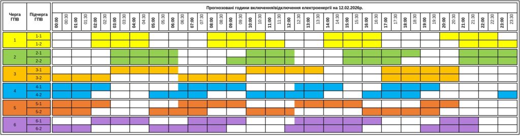 Розклад відключень за чергами на 12.02.2026
