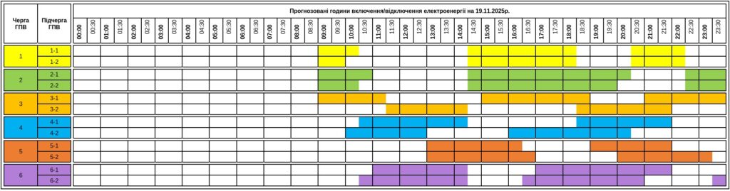 Згідно з оновленою таблицею, оприлюдненою енергетиками, графік на 19 листопада матиме такий вигляд: