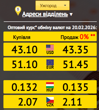 Готівковий курс в обмінниках Ужгорода (20.02.2026)