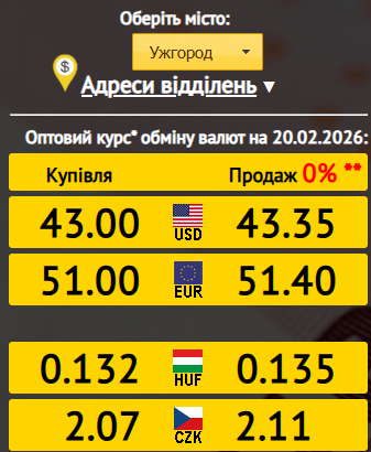 За даними фінансового моніторингу, оптовий курс в обласному центрі Закарпаття на 20 лютого 2026 року встановився наступним чином: