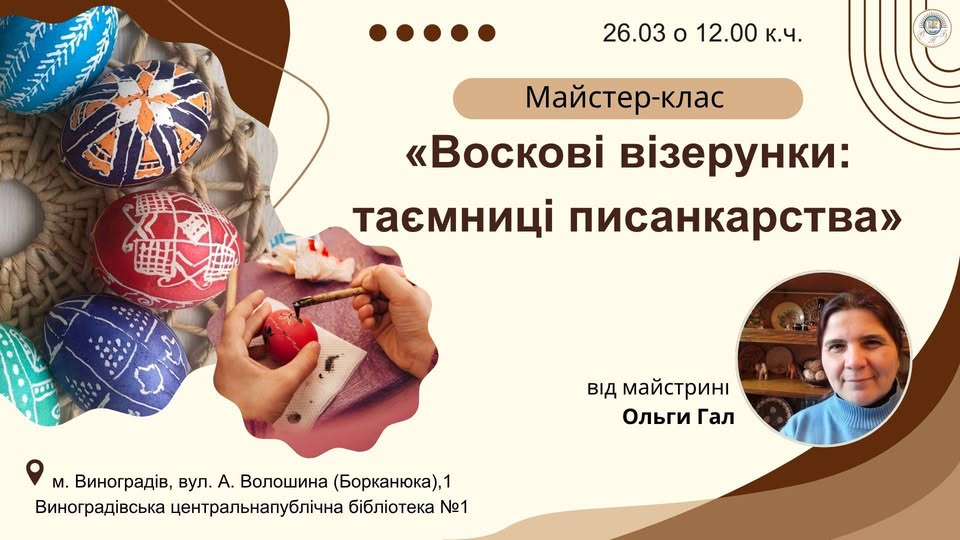Виноградівщина завжди славилася своєю відданістю традиціям. Місцева писанка — це особливий світ, де переплітаються рослинні мотиви родючої долини Тиси та давні символи захисту. Майстриня Ольга Гал, яка проводить заняття у творчій майстерні при бібліотеці, переконана: кожен рух писачка має бути усвідомленим.
