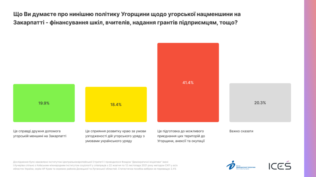 Українці негативно сприймають нинішню політику Угорщини щодо підтримки угорської національної меншини на Закарпатті. 41% респондентів вважає ці дії підготовкою до анексії та окупації. Такий погляд на ситуацію переважає на заході країни – 51%. Молодші респонденти менш схильні вбачати ворожість у діях Угорщини та натомість схильні вважати їх справжньою підтримкою регіону. Цікаво, що ворожість у цих діях найбільше вбачають респонденти, котрі підтримують подвійне або множинне законодавство з усіма країнами, окрім Росії (47%), а також ті, хто підтримує запровадження такої процедури лише з країнами колишнього СРСР (46%). Така сама думка побутує і серед противників подвійного або множинного громадянства як такого – 48%.