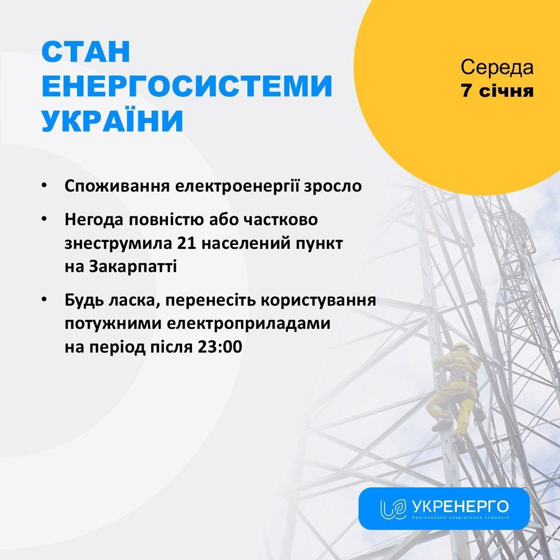 Сильний вітер та опади спричинили аварійні відключення електроенергії у Закарпатській області. Станом на ранок середи, 7 січня, без світла залишився 21 населений пункт. Про це повідомили в національній енергетичній компанії «Укренерго».