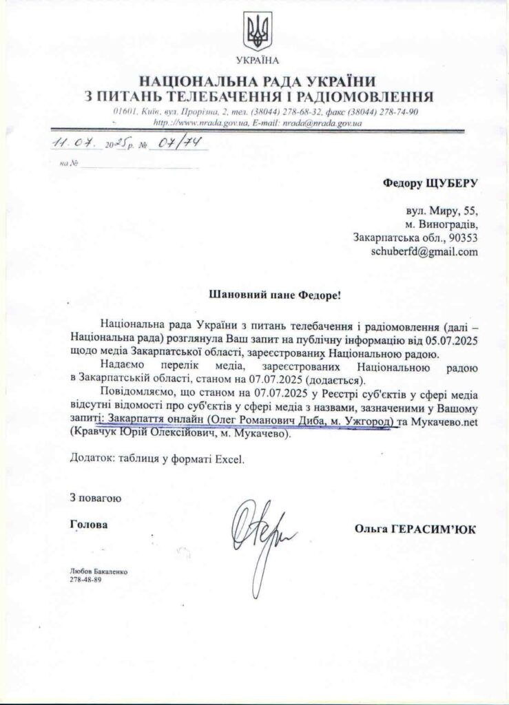 Згідно з офіційним документом, станом на 7 липня 2025 року, відомості про такі відомі онлайн-видання як “Закарпаття онлайн” (керівник Олег Романович Діба, м. Ужгород) та “Мукачево.net” (керівник Кравчук Юрій Олексійович, м. Мукачево) відсутні в Державному реєстрі суб’єктів у сфері медіа.