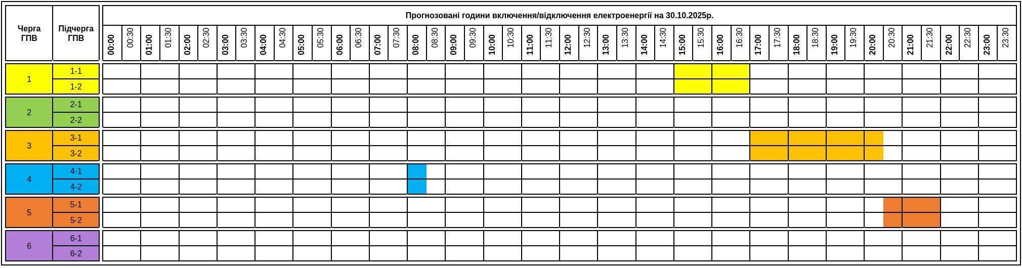 Згідно з оприлюдненими даними, у середу, 30 жовтня, очікуються відключення у чергах 1, 3, 4 та 5. Важливо зазначити, що черги 2 та 6 на цей день, за попередньою інформацією, залишаються із безперебійним електропостачанням. Кожна черга може мати дві підгрупи (наприклад, 1-1 та 1-2), які знеструмлюються одночасно.