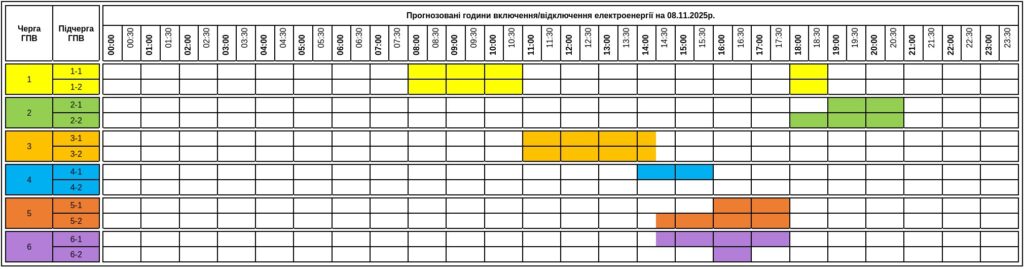 Ось ключові проміжки відсутності електропостачання, згідно з графіком на 08.11.2025: