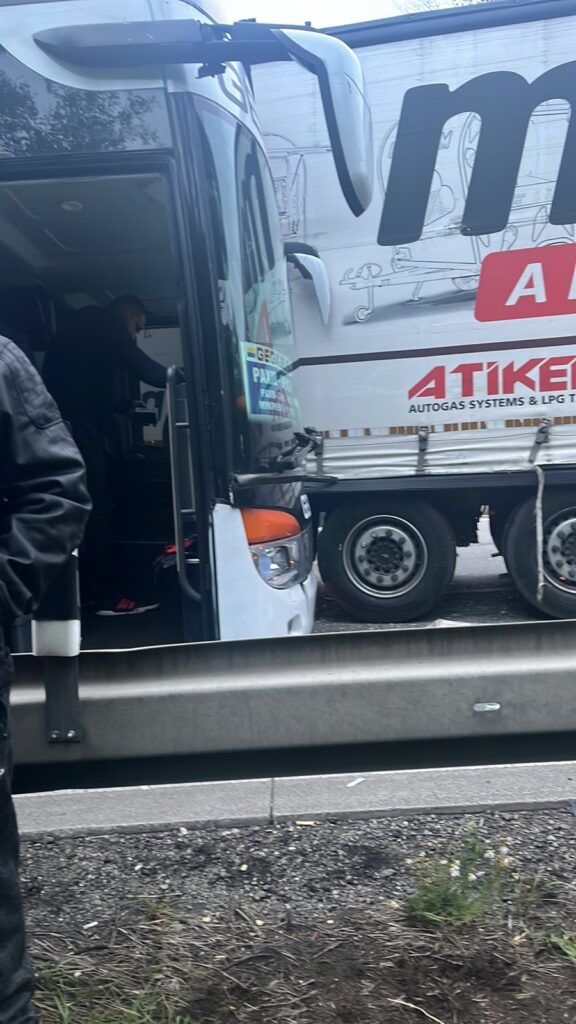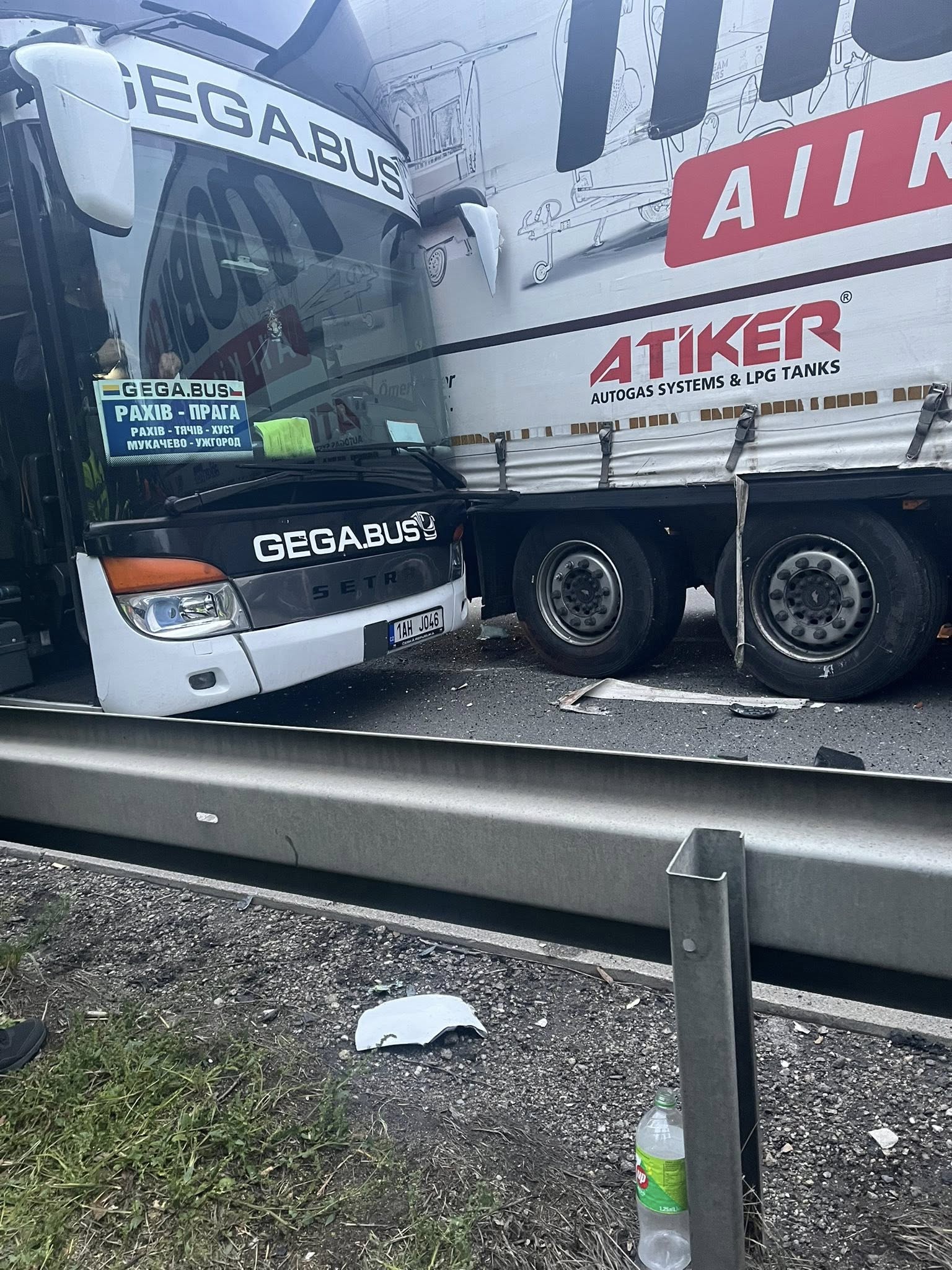 На знімках, які швидко поширилися в соціальних мережах, видно, що автобус, що належить компанії «GEGA.BUS» (як зазначено на лобовому склі), зіткнувся з великогабаритним вантажним автомобілем, на причепі якого розміщена реклама компанії «ATIKER». Удар припав на передню частину пасажирського транспорту, завдавши значних пошкоджень кузову автобуса. Судячи з фото, автобус врізався у бік вантажівки, перебуваючи, ймовірно, на одній із автомагістралей.