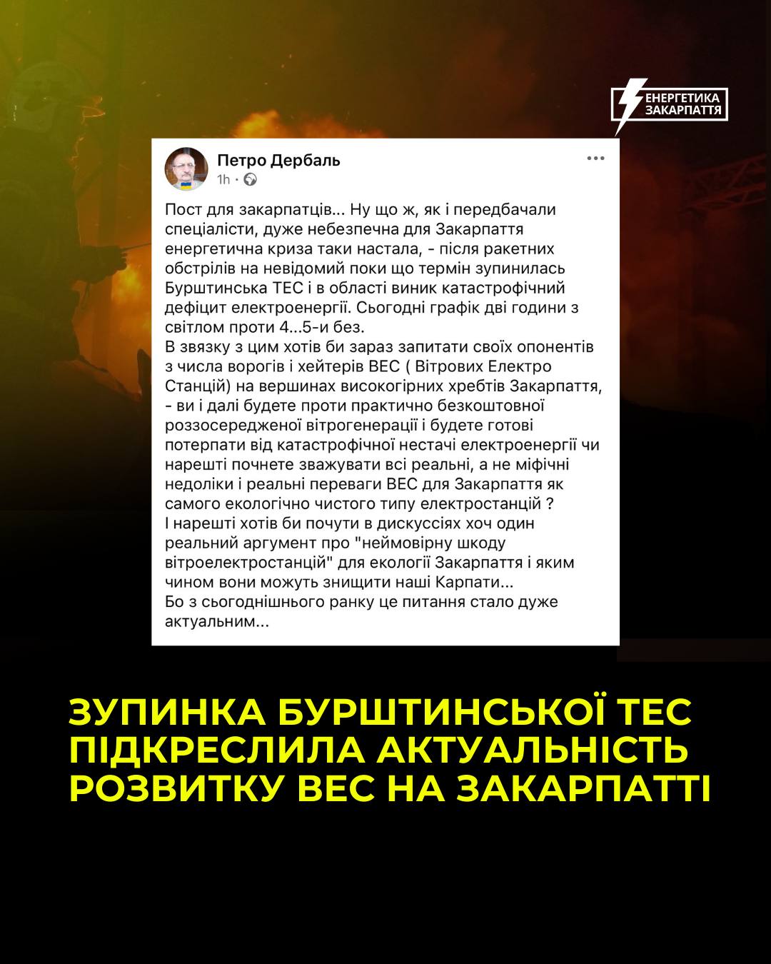 Розвиток ВЕС у Закарпатті став однією з ключових тем енергетичної дискусії після того, як Бурштинська ТЕС у Івано-Франківській області зупинила роботу внаслідок російського обстрілу 7 лютого 2026 року. Ця електростанція забезпечувала світлом до трьох мільйонів споживачів і була важливим джерелом генерації для західної частини України. :contentReference[oaicite:0]{index=0}