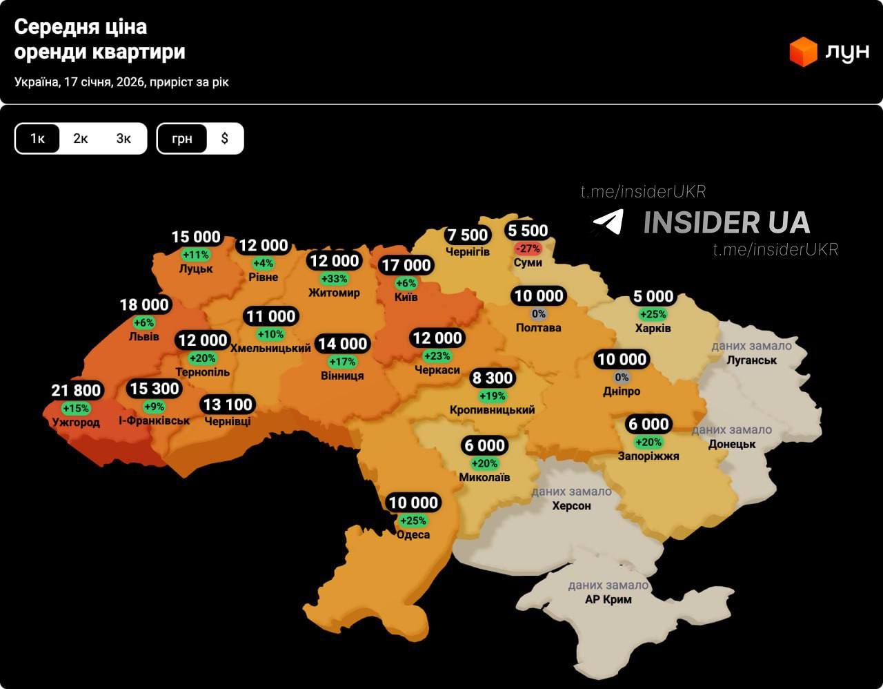 Сегмент оренди демонструє ще активнішу динаміку. Найвищу вартість оренди 1-кімнатної квартири зафіксовано в Ужгороді — 21 800 грн, що перевищує показники Львова (18 000 грн) та Києва (17 000 грн).