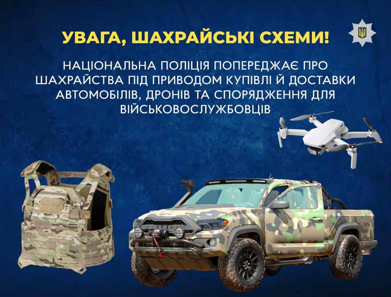 Останнім часом значно активізувалися шахраї, які наживаються на бажанні українців допомогти Збройним Силам України. Зловмисники розповсюджують у соціальних мережах та на торгових платформах оголошення про продаж автомобілів, дронів та іншого військового спорядження за заниженими цінами.