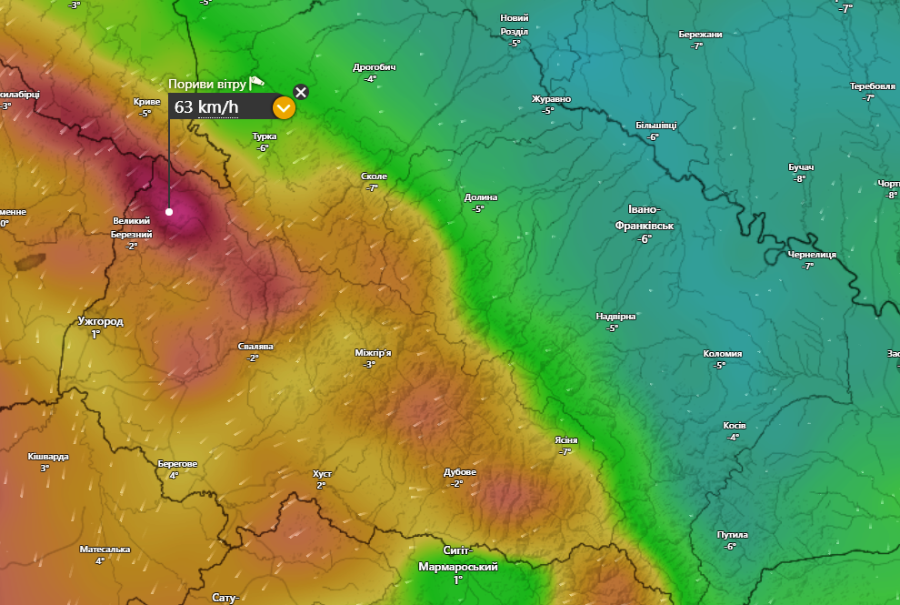 Штормовий вітер Закарпаття знову випробує область на міцність: станом на сьогодні у високогір’ї та прикордонних районах зафіксовано пориви, що перевищують 60–63 кілометри на годину. Найбільш інтенсивні повітряні потоки спостерігаються в районі Великого Березного, Турки та на високогірних перевалах, що суттєво ускладнює рух транспорту та підвищує рівень небезпеки.