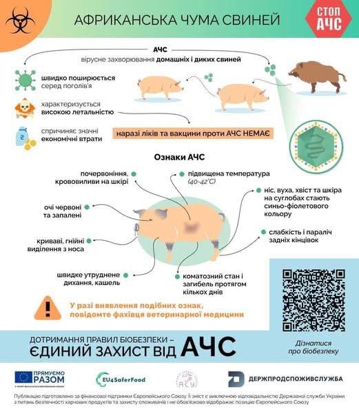 АЧС — це вірусне захворювання, що вражає як диких, так і свійських свиней. Для людини цей вірус не становить загрози, проте він є надзвичайно небезпечним для тваринництва. У разі виявлення хвороби на фермах або в приватних господарствах усе поголів’я свиней підлягає знищенню, що призводить до значних економічних втрат.