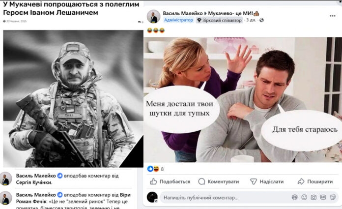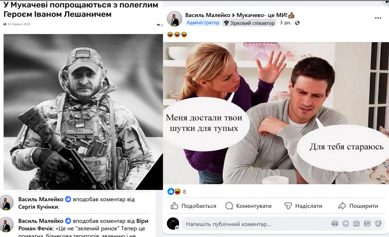 🛑 Промовистий приклад — група “Мукачево – це МИ!”, адміністратором якої є Василь Малейко. Інформація про прощання з Іваном Лешаничем ним не була опублікована, натомість у групі з’являються пости з російськомовними жартами сумнівного смаку.