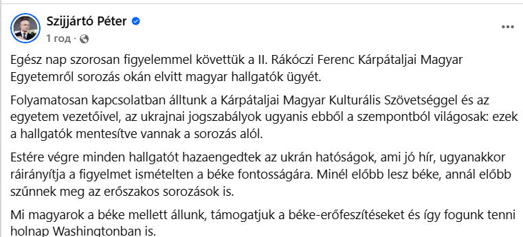 «Ми постійно підтримуємо зв’язок з угорською культурною асоціацією Закарпаття та керівництвом університету. Українська влада зрештою відпустила всіх студентів додому — це позитивний сигнал», — зазначив Сіярто.