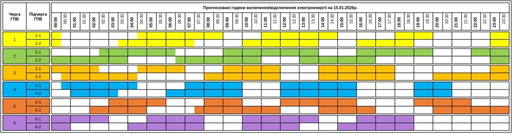 Згідно з офіційними даними ПрАТ «Закарпаттяобленерго», 16 січня в області діятимуть шість основних черг (груп) відключень. Кожна черга поділена на два підсектори для більш гнучкого регулювання навантаження на мережі. Кольорові зони у графіку позначають періоди, коли електроенергія буде відсутня.